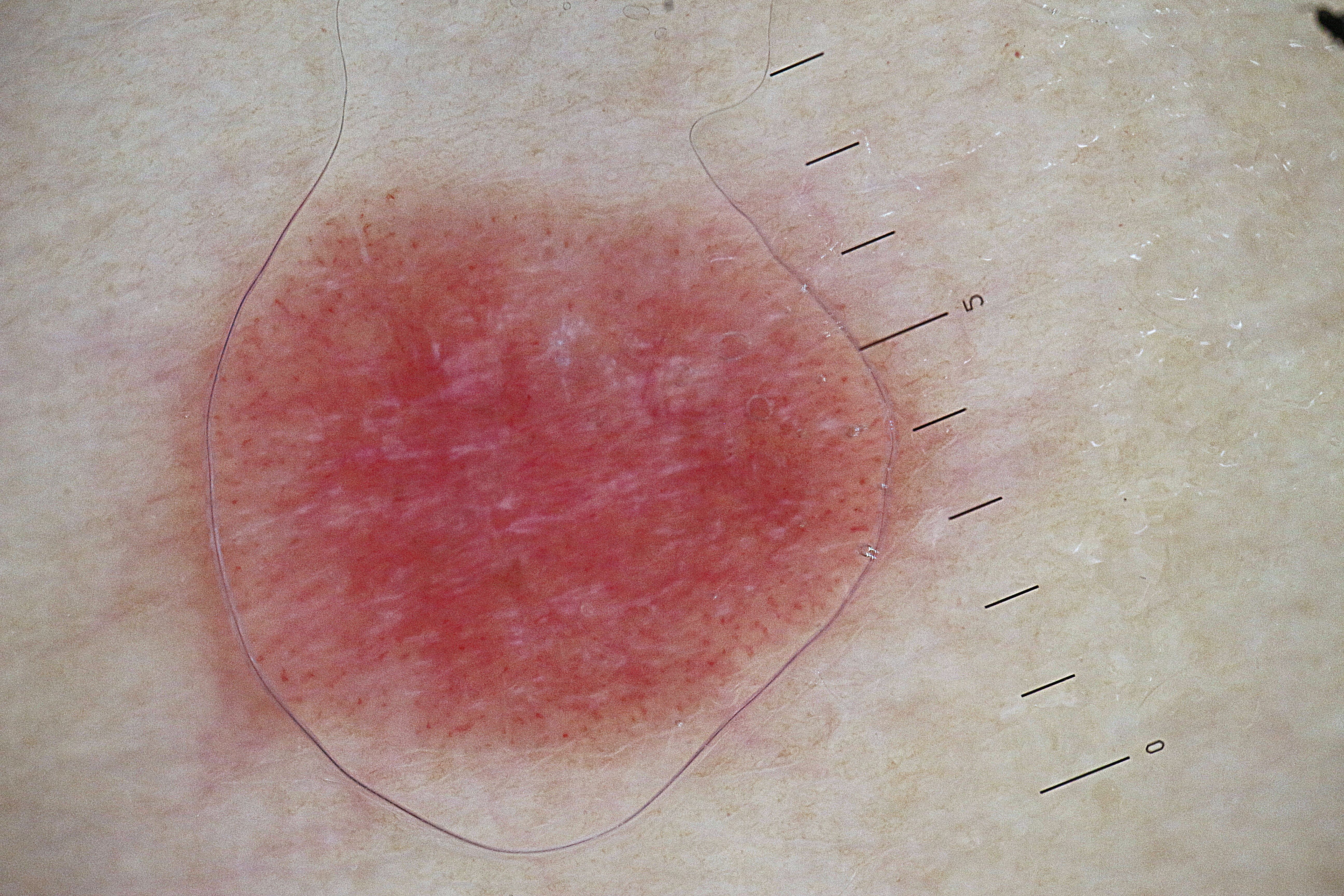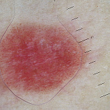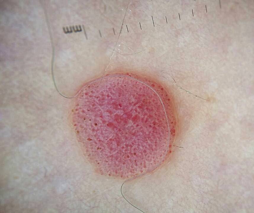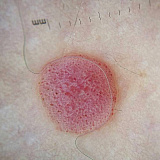 узловатая папула с шероховатой поверхностью, окруженная гало или «кофейными пятнами», имеет неравномерную окраску.
