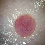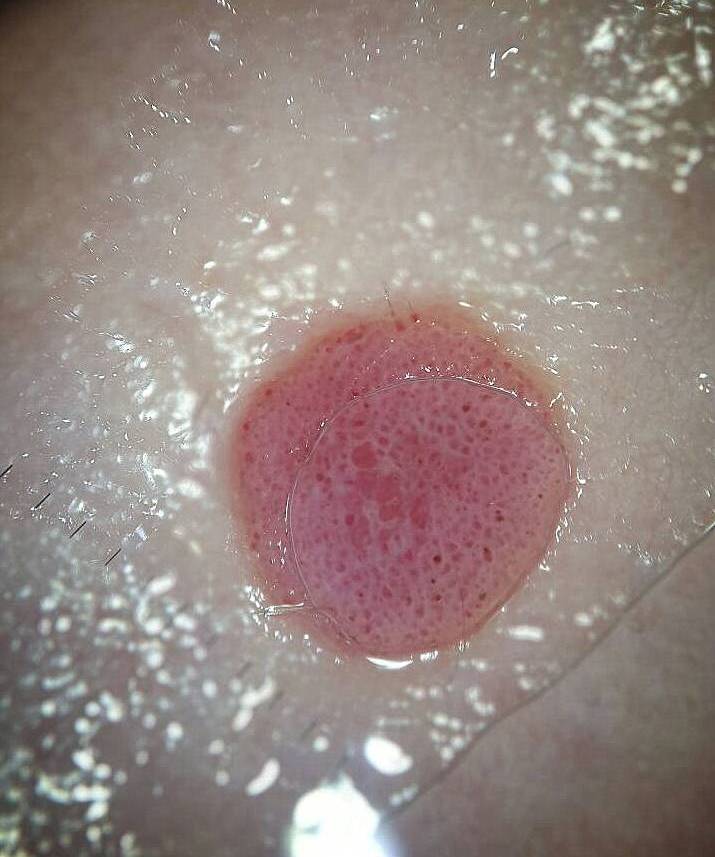 эластичный невус розового цвета (непигментированный), при нажатии предметным стеклом обесцвечивается;